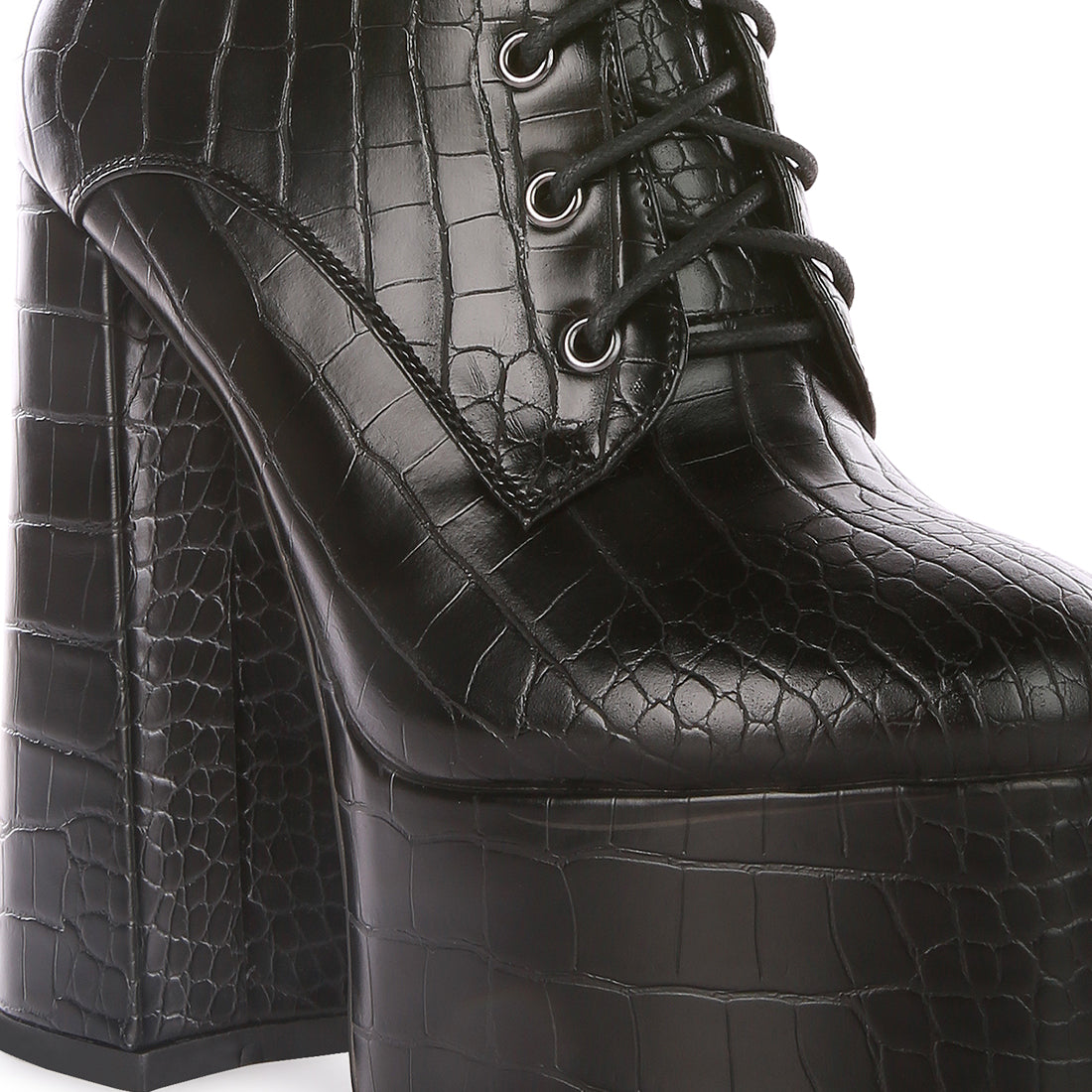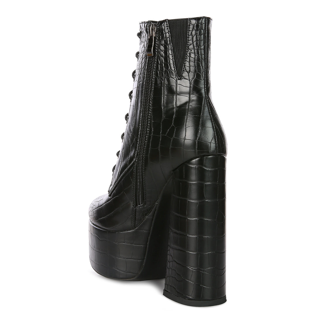 Ultra High Block Heeled boots in croc patterned PU is a delightful and head turner style. It has lace up detail with an easy to wear side zipper facility. It is built on raised platform with lightly padded insole which keeps it easy for the sole.