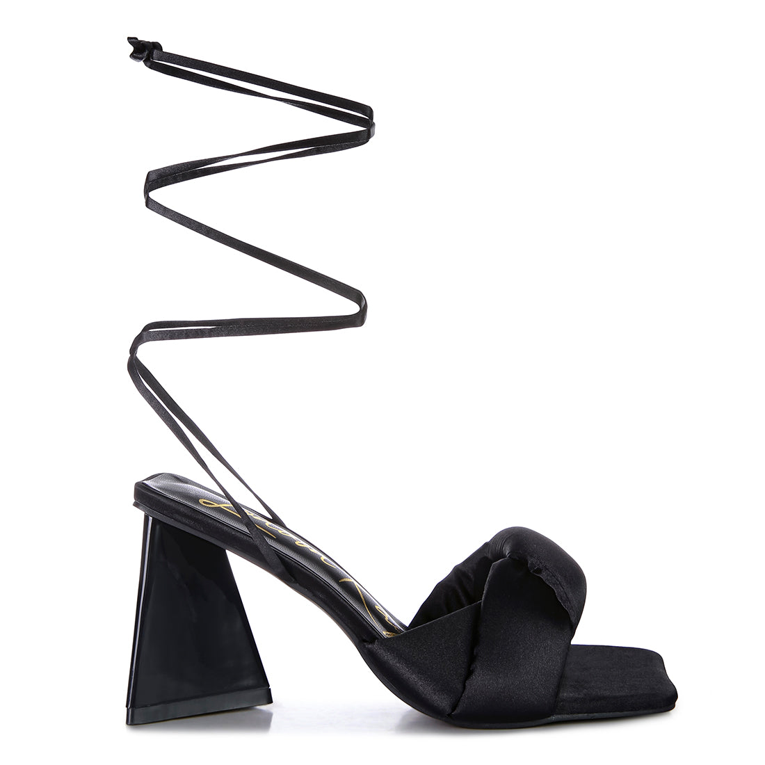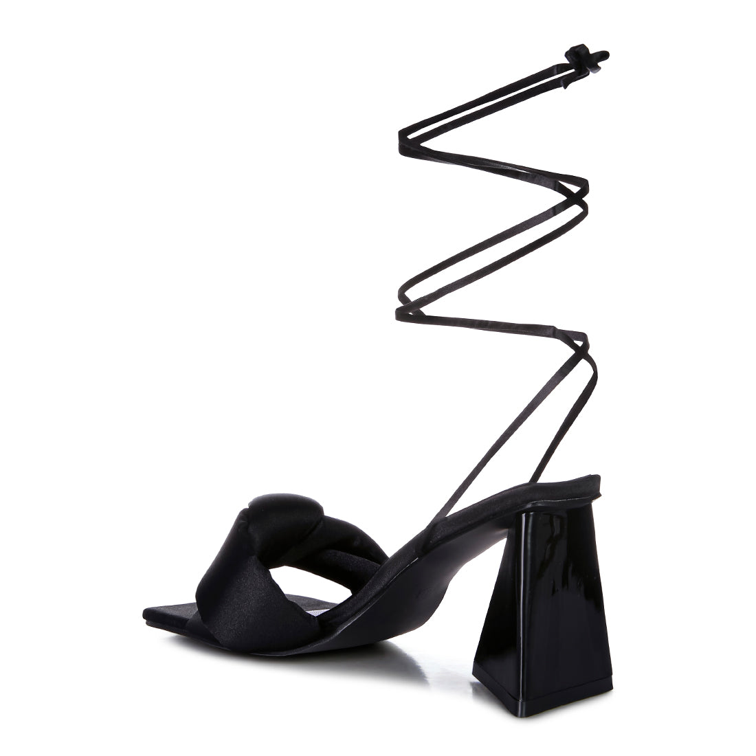 Stuffed Satin Knotted strap sandal with interesting triangle block heel in shiny Patent PU is a party charmer. The high lace up block heel sandal looks gorgeous on feet and will be your favourite casual sandal in no time.