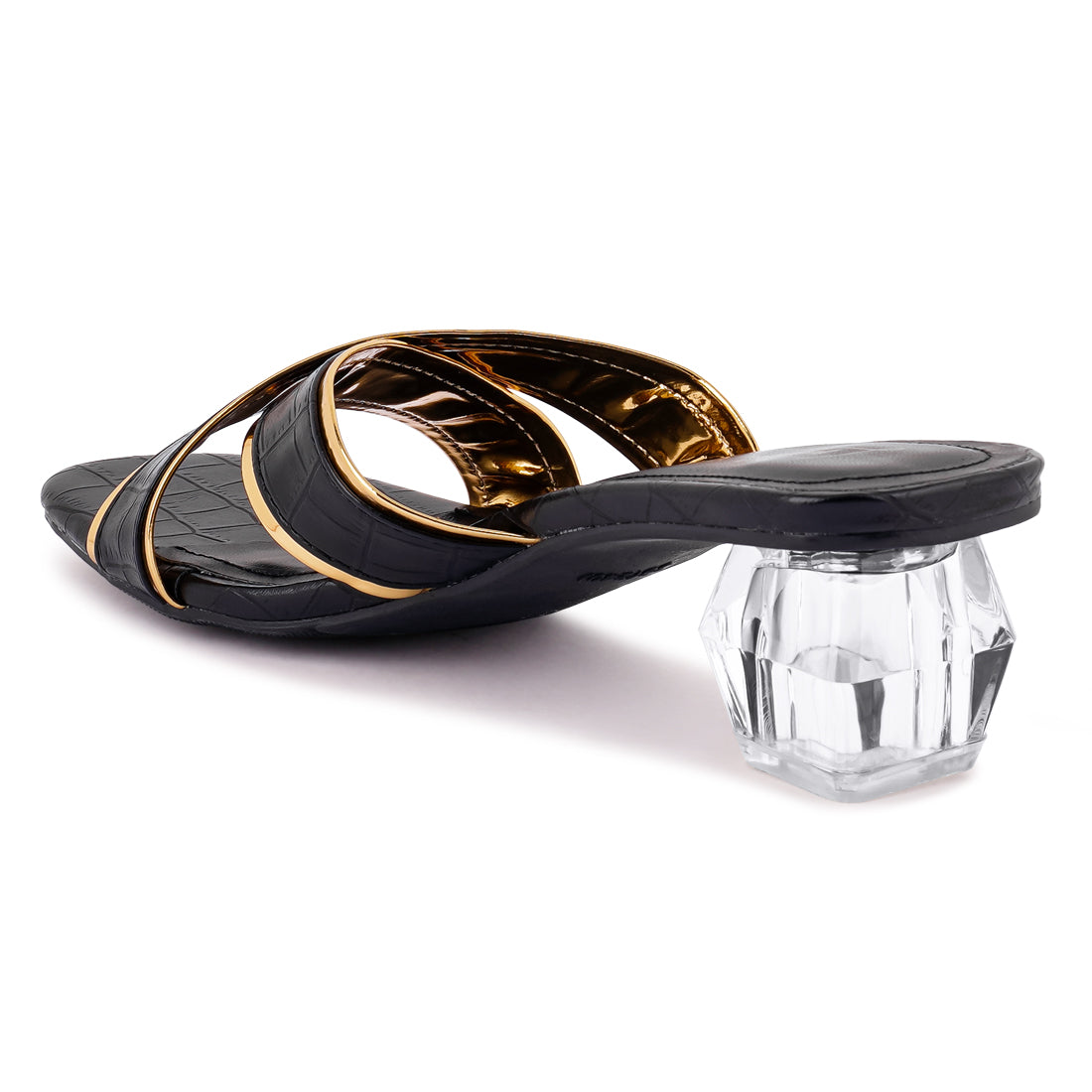 Low clear Heel Croc Textured Sandals with shiny frame cross straps. Stylish pair of comfortable slides for all daywear and casual styling.