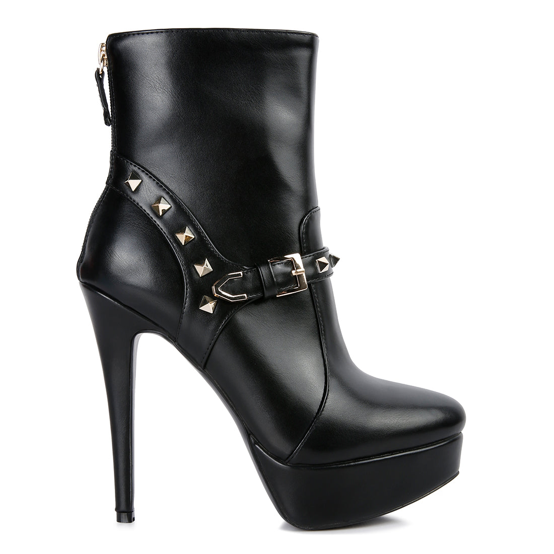 Round Toe high heel boot built on raised platform, this ankle boot has metallic pin buckle ornamentation with metallic studs. The elasticated gussets on the top adds to the fit. The back zipper opening makes it easy to wear.