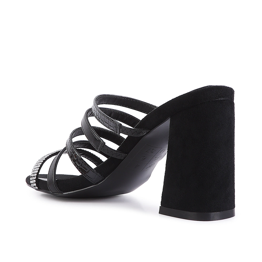 High Block heeled multi-strap sandals with croc textured mono tone straps and diamante detail; the edgy high heel sliders have light cushioning which cuts strain and looks good on feet.
