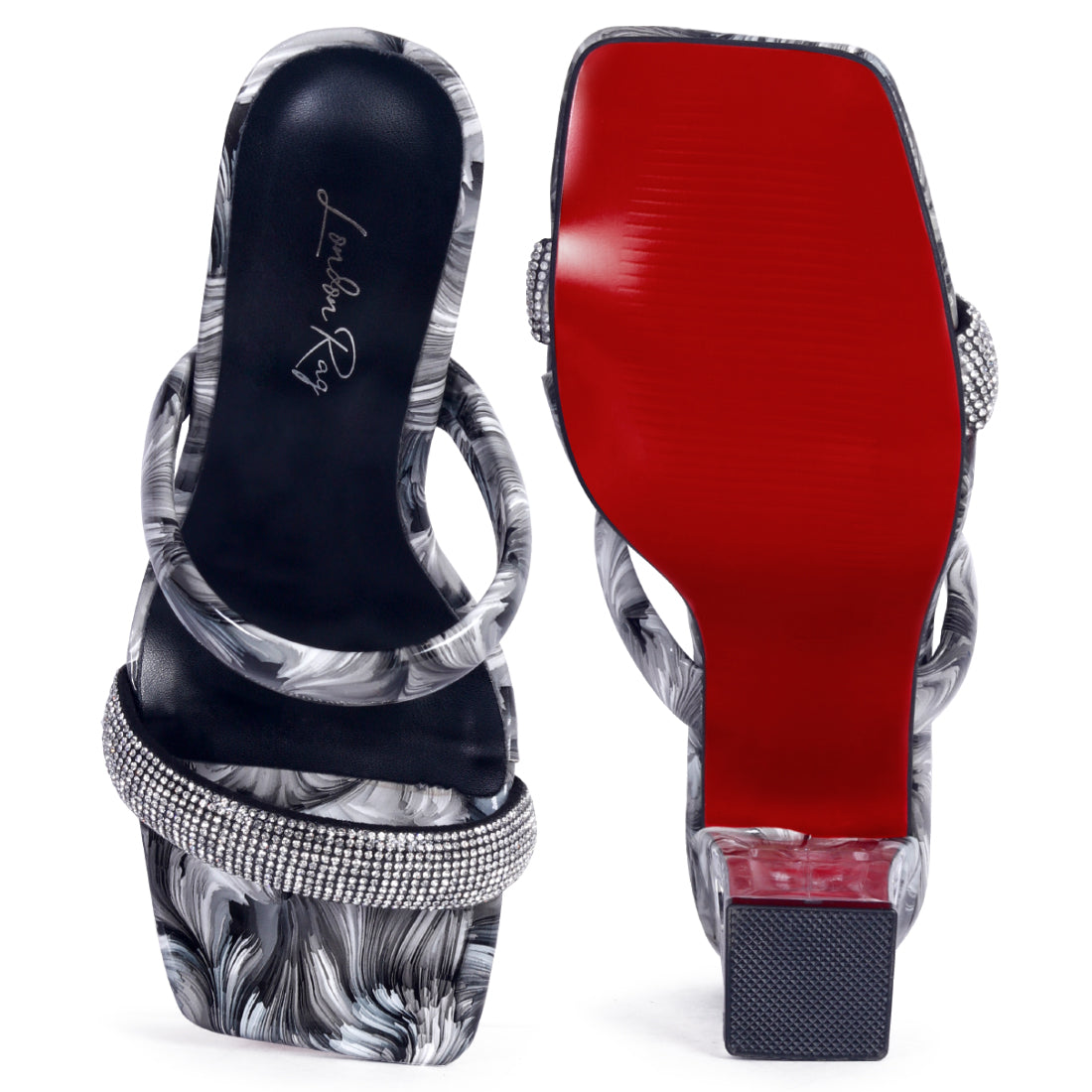 Gorgeous pair of slides in colorful marble prints - has crystal-lined strap detail and a see-through Transparent block heel.