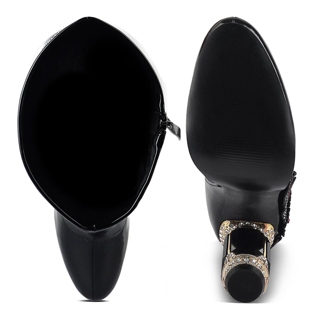 These boots are the epitome of sublime chic with the gorgeous rhinestones embellished patchwork. The embellished jewel fantasy heel accentuates the design with its extravagant touch and gives the boots an opulent look. The high heeled boots are also quite versatile and a must-have for fashion-forward pupils!