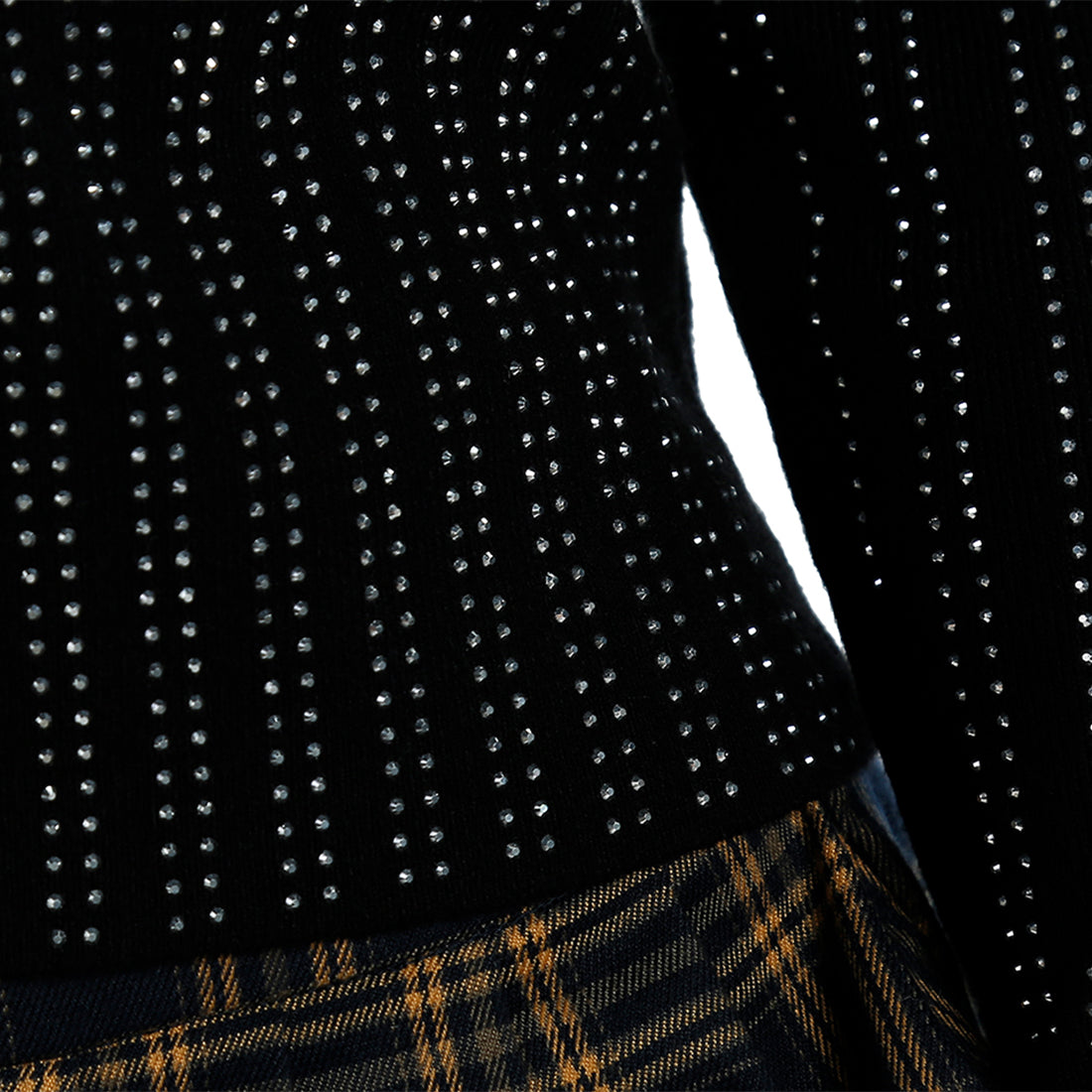 The full sleeves top with the tiny sequin stripes is beautiful and has an understated glamorous touch that is alluring. The top has a snug fit and hugs your body beautifully to flaunt your curves. Pair it with a faux leather skirt and some knee high boots for a charmy and bold look!