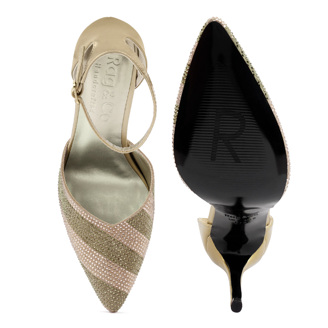 The High Heeled Sandals with patent pu at the back which shines just right has detailing on the soft microfiber with sparling diamantes are treat to the feet. The pair comes with lightly cushioned insole and pin buckle fastening which secures feet well and look dainty!