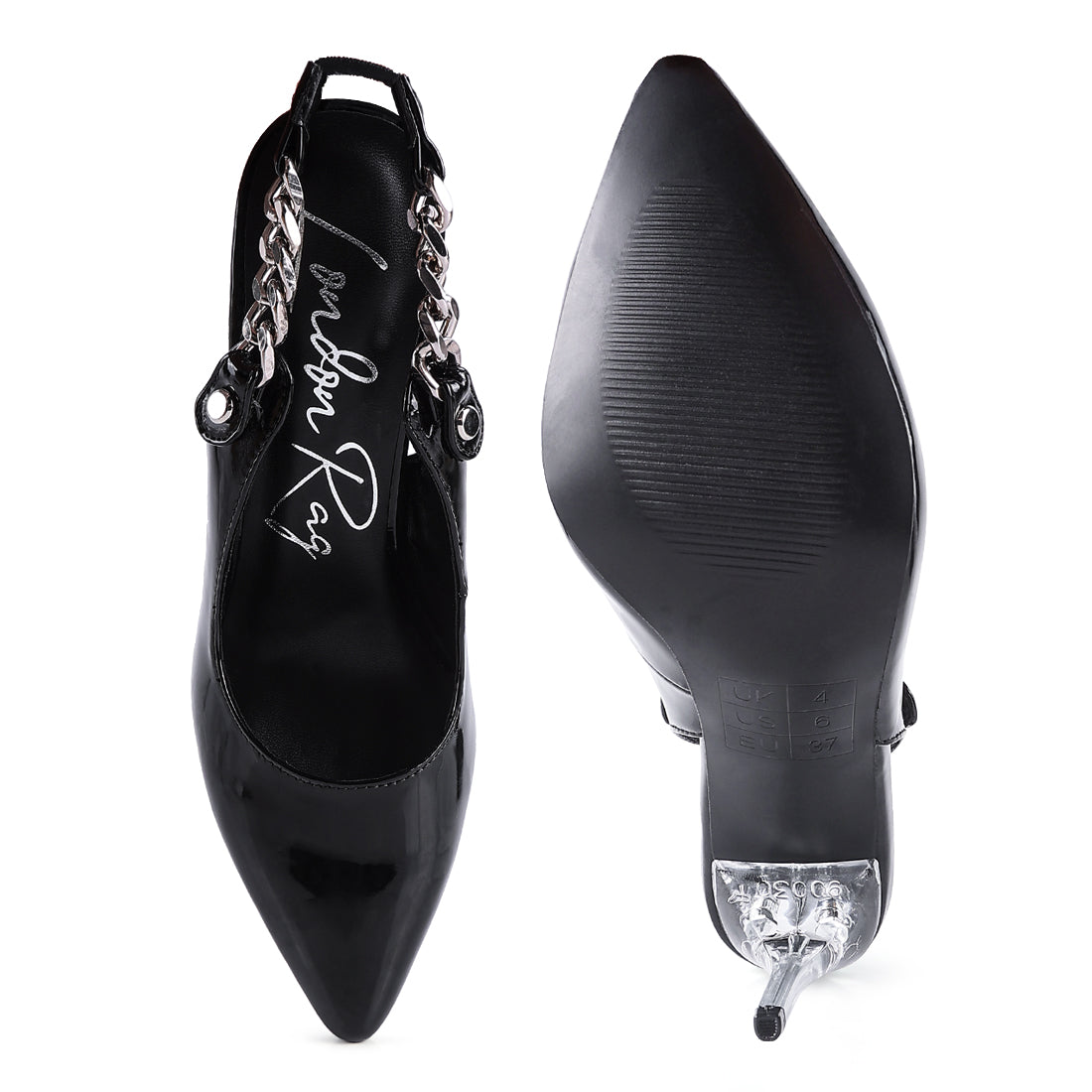 Pointed Clear High Heeled Sandal - stay glam high with the patent PU pointed shoes which have a metallic chain attached to elastic slingbacks. Comes with pointed closed toes which look sharp and appealing has a lightly cushioned insole.