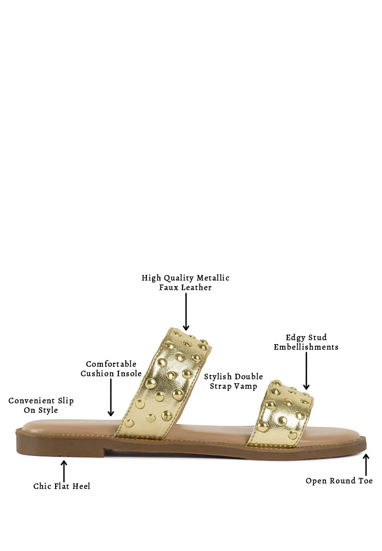 The slip ons are the perfect amalgamation of glamorous and comfortable, with the flat heels and edgy stud embellishments that give the footwear a bold look. The slip on sandals are perfect for a brunch outing or even as after party shoes paired with a pretty little cocktail dress.