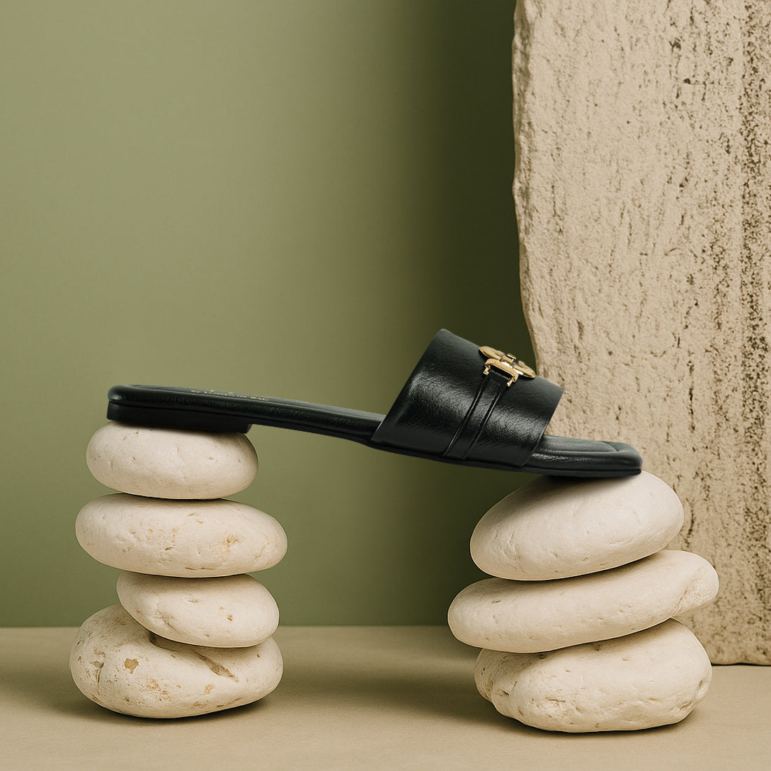 Versatile, chic, and easy to wear, the metallic buckle detail slip on sandals are a convenient and stylish go-to pair. Style them with casuals or formals, the chic slip-ons are a comfortable choice any day!