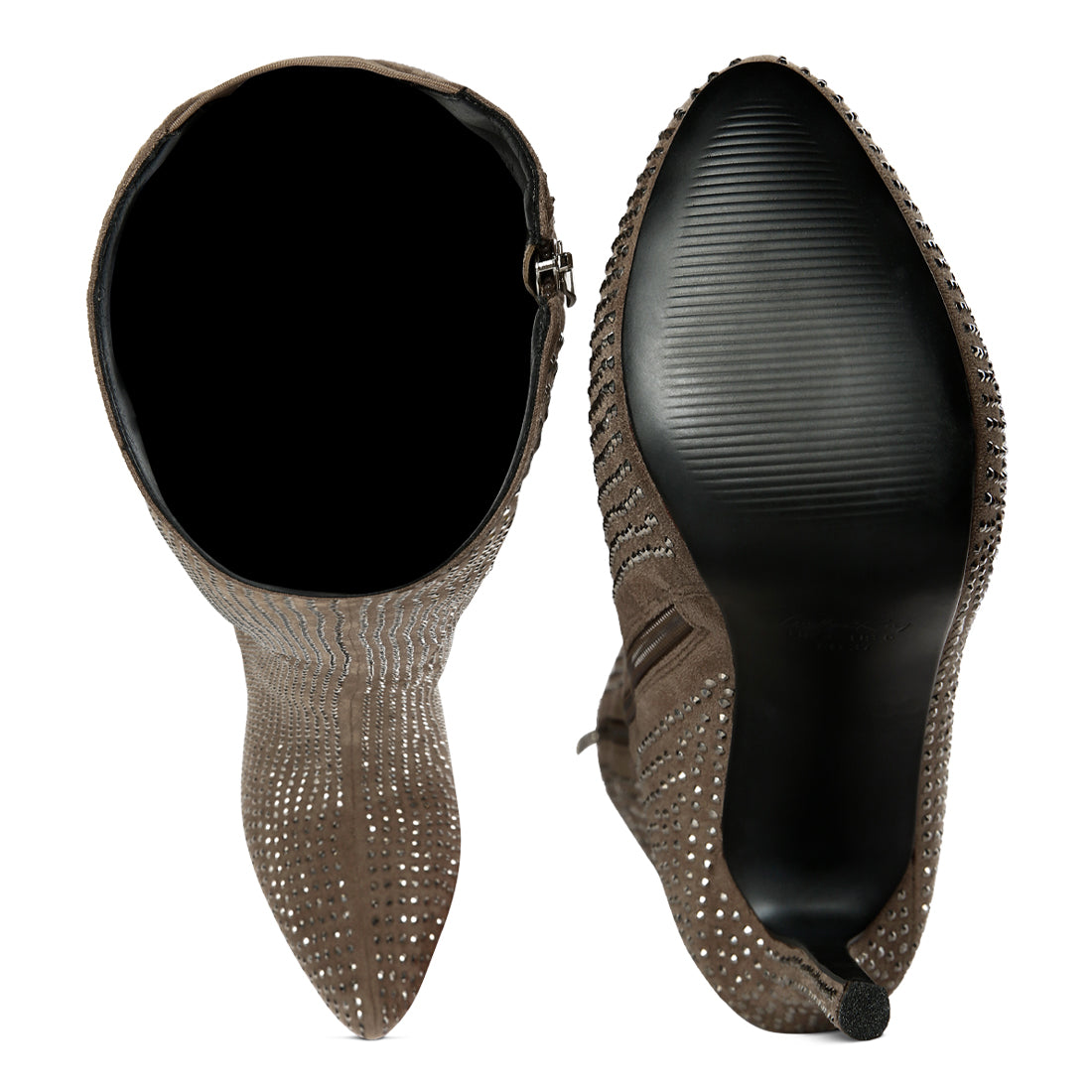 High Platform stiletto heeled long ankle boots which are calf high - these have all over heat set diamantes on microfiber. Comes with side zipper opening which makes it easy to wear. The pointed toe high platform boot is a winter dream dressing tale.