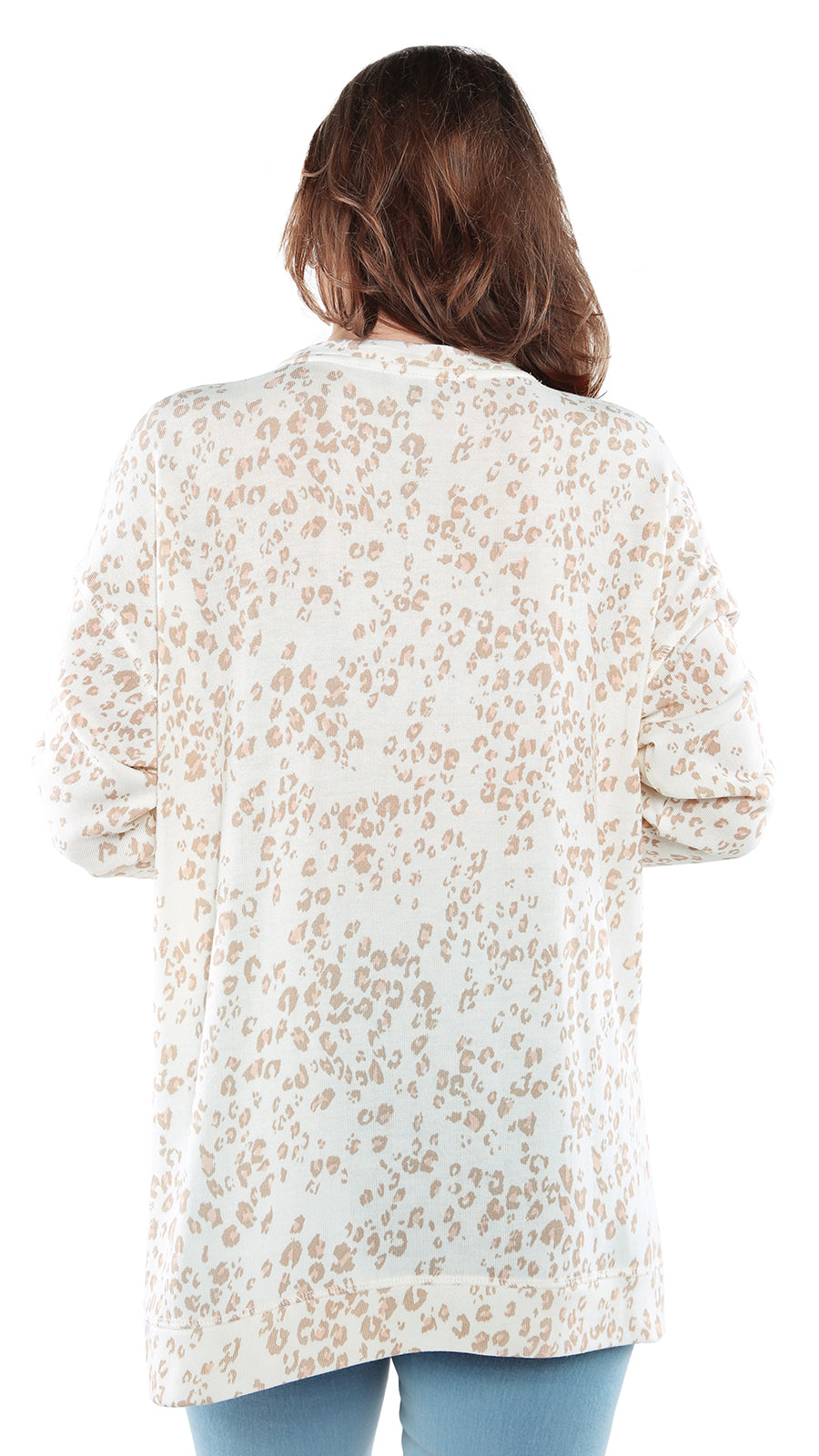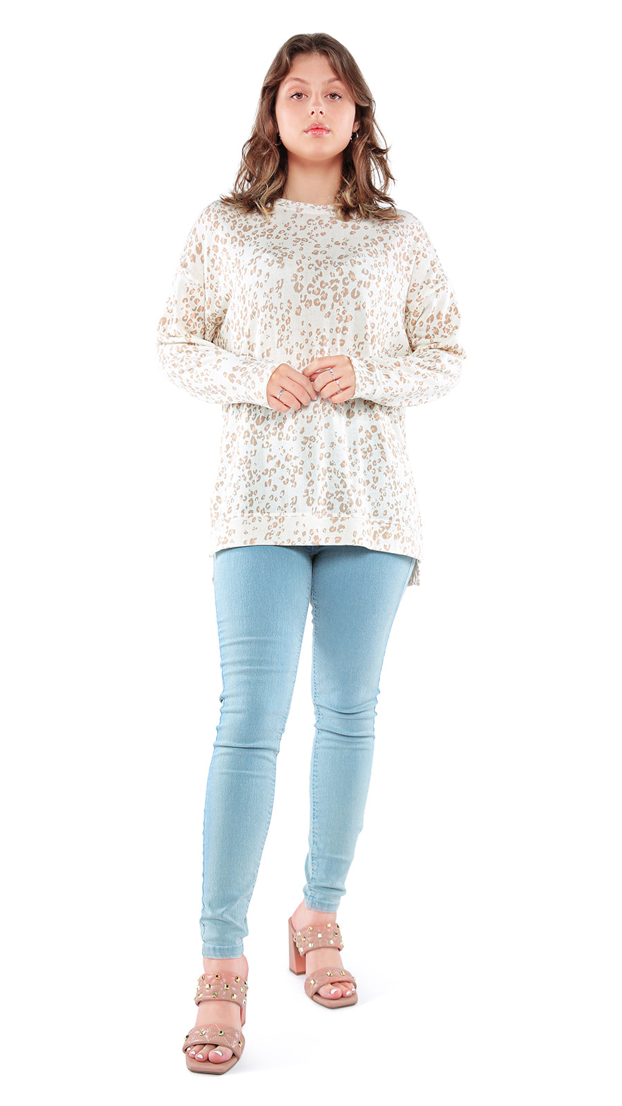 Crew neck printed oversized tunic top in fleece. The soft fabric top has rib-knit hem and drops shoulders with all-over printed detail.