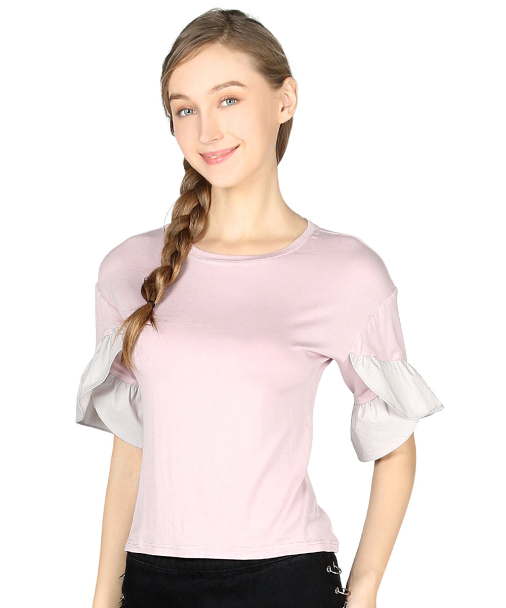 -Solid color, round neck, half petal sleeve casual top Comfortable for every day.